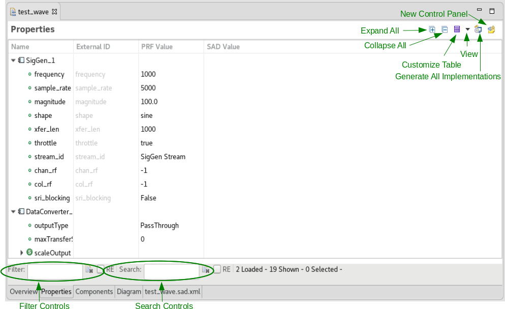 To open the Waveform Editor, double-click a Software Assembly Descriptor (SAD) file from the Project Explorer view. The Waveform Editor contains an Overview, Properties, Diagram, and a raw XML tab, which contains the SAD file content.
