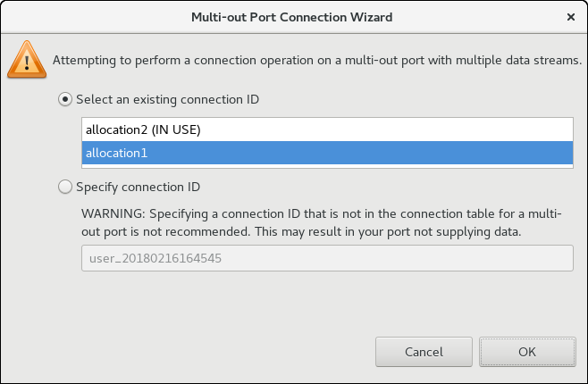 When performing an operation on a multi-out port, if there is only one connection ID, it is used by the IDE. If there are multiple connection IDs in the connection table, the IDE displays the Multi-out Port Connection Wizard dialog with the option to either select a Connection ID from the entries in the connection table or input one manually.